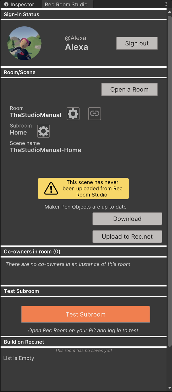 If you have not opened this room in Rec Room Studio on your device before, it will download the latest files from the rec.net server into a folder called Assets/Rooms/[roomname]. If your local files are out of date with the server’s it will ask you to use the “Download” button to get the latest from the server.